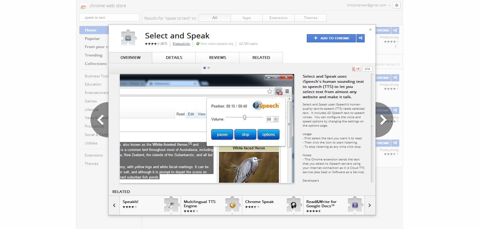 Select and Speak Google Chrome extension by i Speech is really good for assisted technology for anyone who needs text on the web read to them. For educators familiar with products such as Read & Write Gold, Select and Speak is a free and accessible extension for students at school as well as at home.