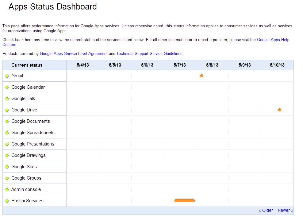The Google Apps Status Dashboard offers performance information for Google Apps services. Viewing this webpage will let you know if any Google Apps services have no issues, service disruption, or service outage.