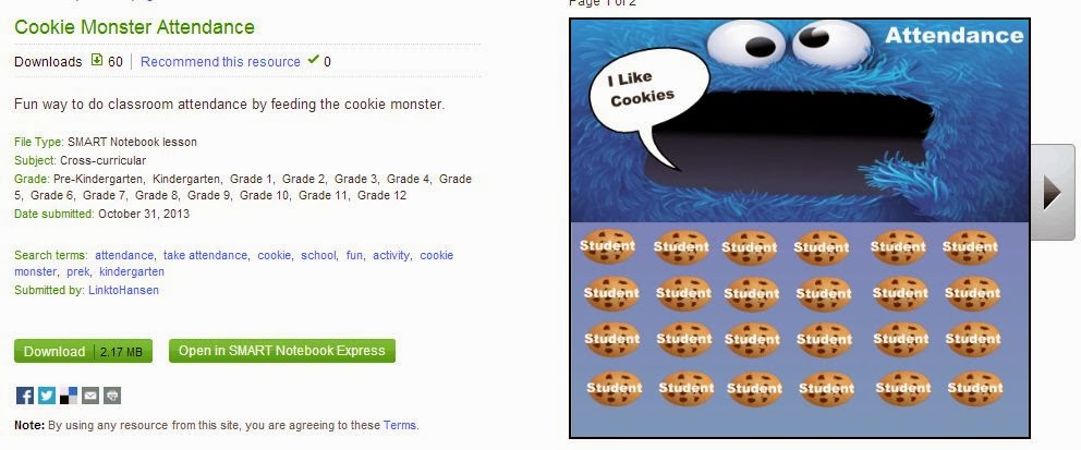 For those of you who are SMART Board Interactive Whiteboard teachers and teach young children here is a Cookie Monster template that I made for you to use. The shared link will direct you to the SMART Exchange (great resource for SMART Boards) where you can sign in and download this for free!
