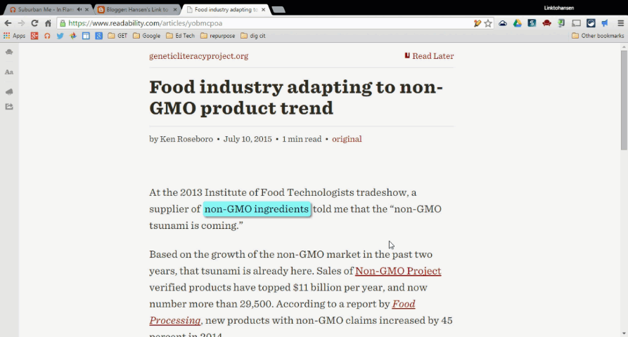 1. Have student search an article/site/source online for whatever project/lesson for the day. Students do not need to use Readability, however this extension allows for easy viewing for students and teachers.