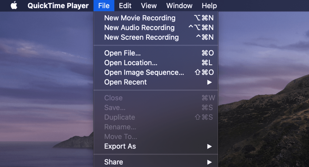 - In the File menu you will see three options for recording (Movie, Audio, Screen). Figure 1